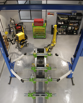 自動車事故によって車の骨格部分(フレーム)にダメージを負った場合には、フレーム修正機を用い、修復作業を行います。